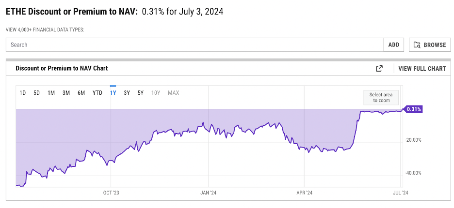 On July 3, 2024, ETHE traded at a premium to its Net Asset Value (NAV), indicating potentially higher relative institutional interest compared to Bitcoin (BTC). It is noteworthy that despite Grayscale Bitcoin Trust (GBTC) trading at a discount until the launch day of spot BTC ETFs, these ETFs have subsequently garnered over $16 billion in net inflows.